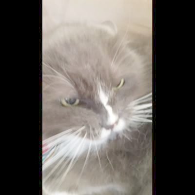 A woman tells a cat on a staircase to say grandma, then it growls and swats at her face.