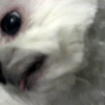 A dog sits on a couch and an off-camera woman says "How's it going?" The person puts a camera in the dog's face and the dog shows their teeth and growls each time the camera is held up in front of them.
