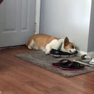 A man asks his dog if he can have his shoes back and the dog growls and then barks at him and bares his teeth before he attacks the man's feet.
