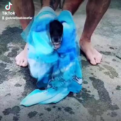 A dog growls and shows his teeth as a man dries him off with a towel after a bath in the yard.