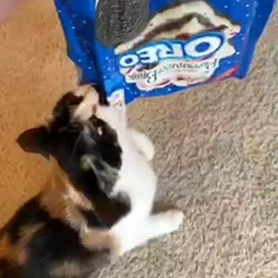 A woman takes a package of Oreo cookies back from a cat, who growls and holds on to it as long as he can.