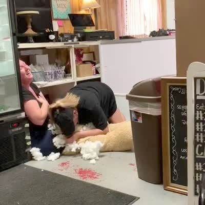 A senior woman sees a giant teddy bear at work and walks over to it while she says it's cute, a woman inside the bear growls and reaches out to her and she screams while she runs away.