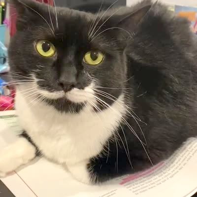 A cat meows and growls while he sits on a young womans's textbook at home, and the young woman asks if she can do her homework.