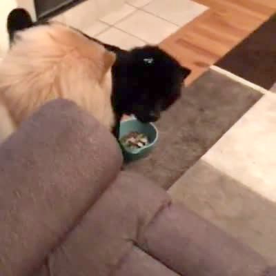 A dog growls in front of a food bowl until another dog next to her walks away, then she walks away and the other dog walks around the couch to the bowl of food.