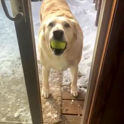 A Labrador dog howls with a tennis ball in his mouth on the back porch in the winter snow.