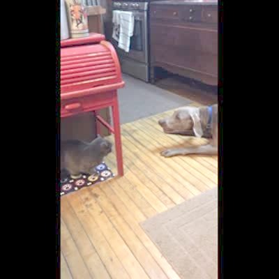 A great dane dog growls and barks at a cat in the kitchen, then runs when the cat starts to chase him.