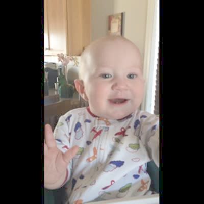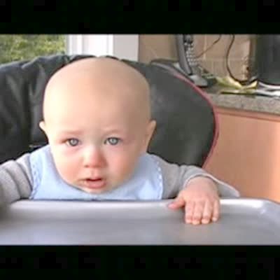 Baby boy sits in high chair & grunts while he poops & looks at the camera. Poopy face.