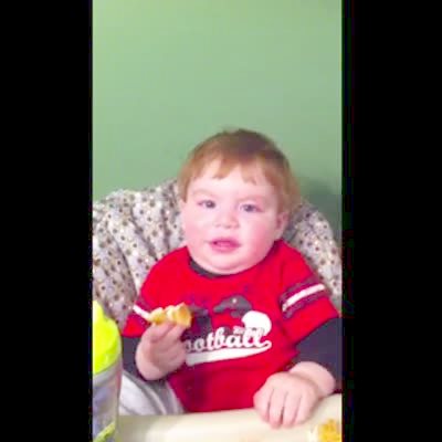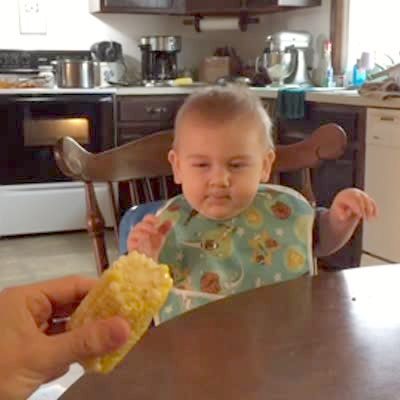 A man takes a cob of corn away from his baby tot son and the boy grunts angrily until he gets his corn back.