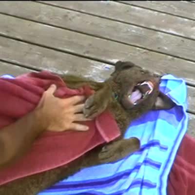 Big brown dog lays on back & gets dried off after bath, looks very scary. He makes grunting noises & shows his teeth. A.A. Pet baths. Silly pet tricks.