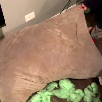 A woman cuts open a dog bed and pig is inside and grunting in the living-room.