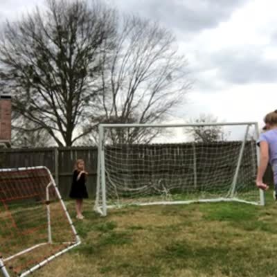 A young girl kicks a soccer ball that hits her younger sister in the face. The girl second guesses checking on her sister or stopping the camera and decides to stop the camera.