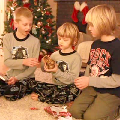 Three young brothers open a dog bone on Christmas. Their mom asks them "what animals eat bones?" to suggest that they're getting a dog but they guess dinosaurs, turtles, owls, and cats before realize it.