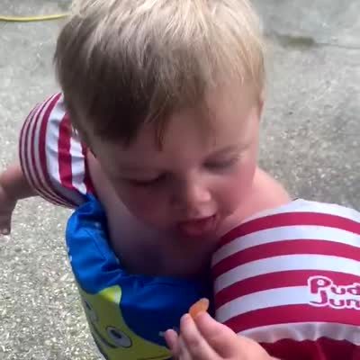 A tot boy in a yard holds a gummy in his hand and tries to eat it but he can't reach it because of his swim floaties and the woman with the camera laughs.