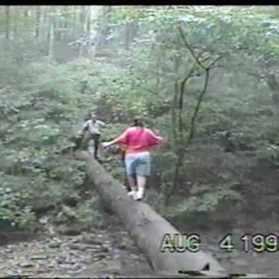 A woman walks on fallen tree as a bridge across a stream. She gets to the other side and slips off. On her way down she grabs a man's head and pulls his hair. He screams