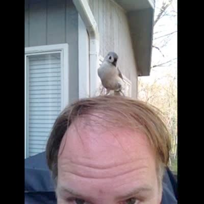 A Tufted Titmouse bird pulls a man's hair outdoors and flies away.