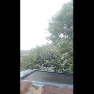 A teen girl flips on a trampoline, lands on her back, and her hair gets stuck in a spring, pulling her back down by her hair.