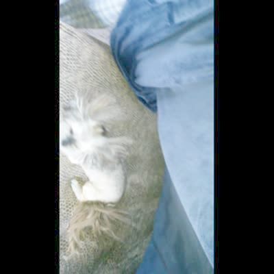 White schnauser dog pulls / bites on teen girl's hair scrunchie/ holder while she is on the ground laughing.