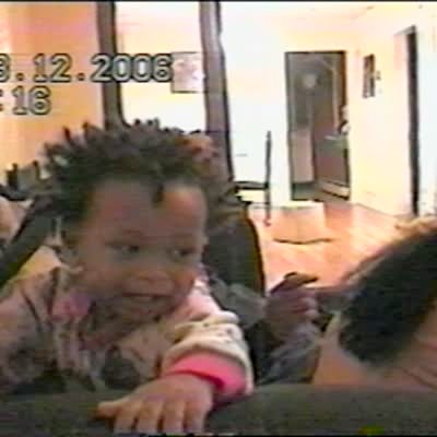 A man films a closeup of a tot girl in the hallway and asks her if she had used any of his hair products. The tot girl responds and the man pulls the camera back to reveal that the tot girl has a long strand of hair that sticks straight up in the center of her head.