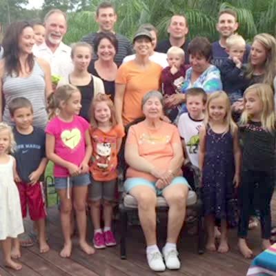 A large family poses for a wedding video and a baby pulls off a senior woman's wig making the family all laugh.