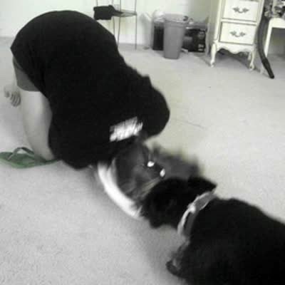 Teen girl & Scottie dog play tug of war with a towel inside house. The dog suddenly grabs girl's ponytail & pulls.