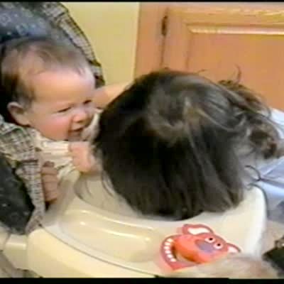 A woman scares a baby by yelling in its face then backing away when it grabs her hair and pulls its high chair over.