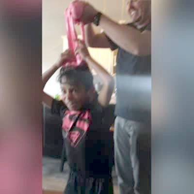Man lays on the floor and lets teen boy & girl wax his chest hair by putting waxing strips at the end of a rope & pulling them off with an electric scooter / wheelchair.