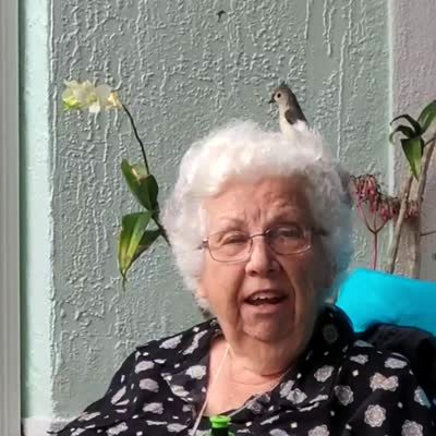 A senior woman sits very still in a yard while a wild bird sits on her head and pulls her hair.