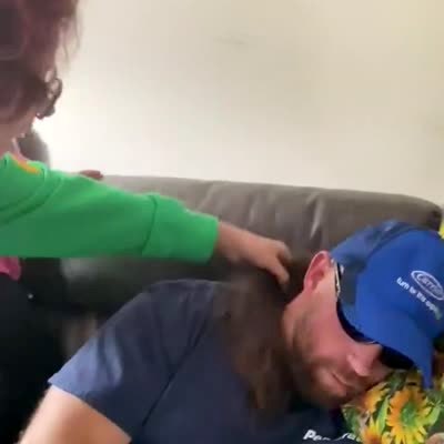 Teen girl puts makeup and a wig on her dad while sitting in the bathroom. Pulls his chest hair out and pokes him in the eye. #AFVDad musical.ly AA