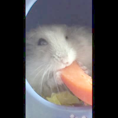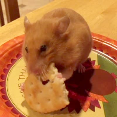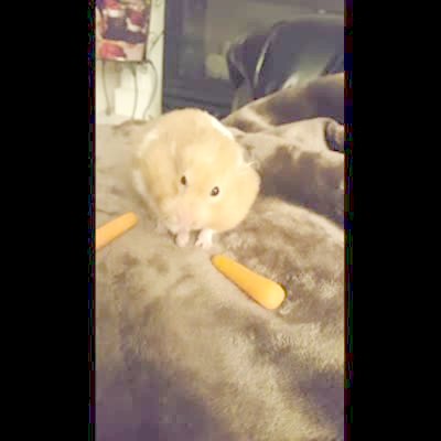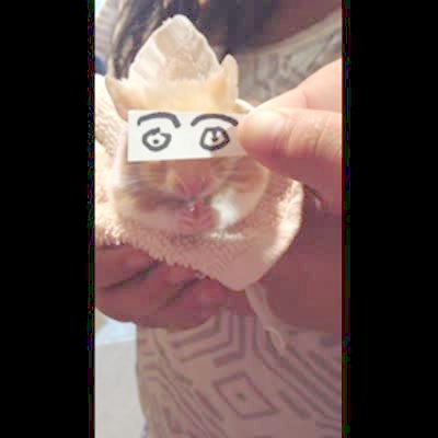 A hamster with hand drawn paper eyes over its face indoors. AA: Make some paper peepers.