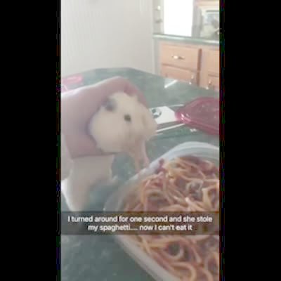 A hamster eats a long string of spaghetti as a woman lifts it in the air.