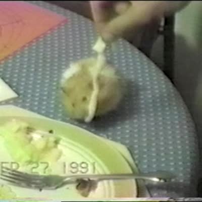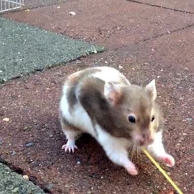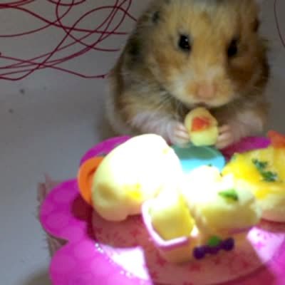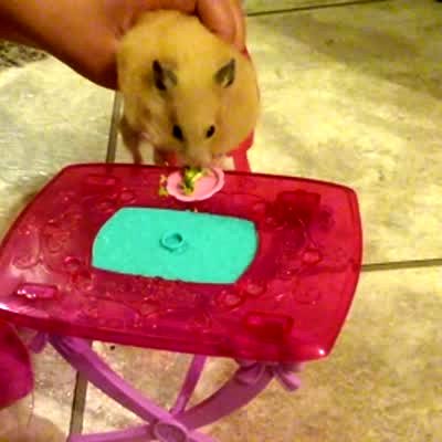 A hamster nibbles at a piece of food as it sits in an adorable hamster high chair. Music rights not cleared.