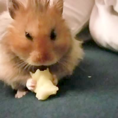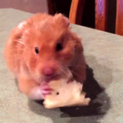 A hamster eats. He stuffs his cheek with a big treat and he can't chew it.