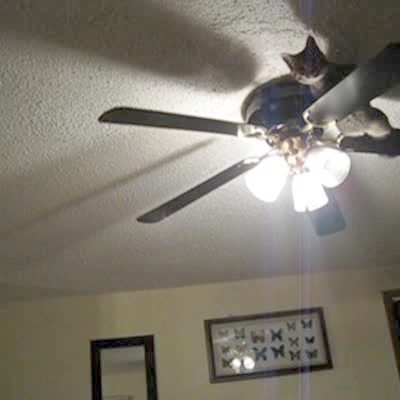 Gray cat runs on the blades of a ceiling fan like a hamster on a wheel.