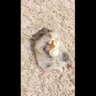 A hamster licks ice cream out of a mini ice cream cone in the living room. AA: hamsters eating