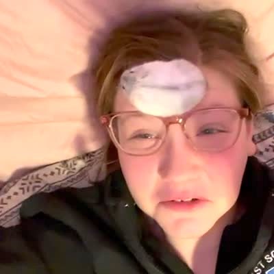A teen girl films herself with hamster on her forehead and hamster spits out its food on her.