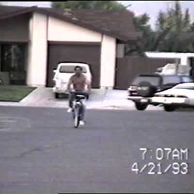 Biking. Man rides bicycle bike "no hands, no feet, no teeth ", then crashes into parked car truck dodge.