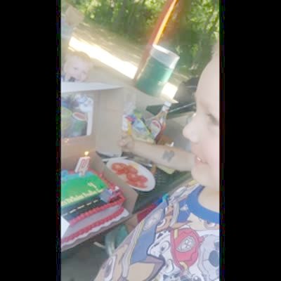 People sing "Happy Birthday" to a young boy at a picnic table, the boy tries to blow out his candle and falls over, his face falling in the cake. Short tail.