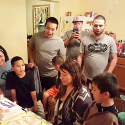 A boy and girl sing the Happy Birthday song to a woman at home. When the woman closes her eyes to blow out the candles, the boy puts a cup of flour in front of her face. The flour flares up and covers her face. practical joke