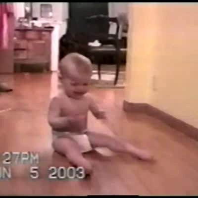 A little boy tries to do one arm push ups indoors and falls, hitting his head on the hardwood floor. He laughs. Short head and tail.