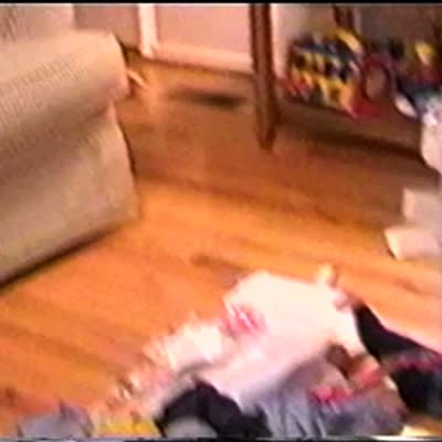 Man rides a toy stick horse, he slips & falls on a hardwood floor. Christmas morning. Bonehead.