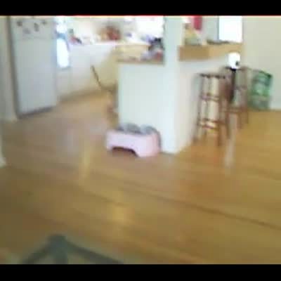 "Furry In A Hurry" White fluffy cat gets scared / startled by kitchen timer going off. It dings, cat can't run away fast enough - skids on the hardwood floor like a cartoon
