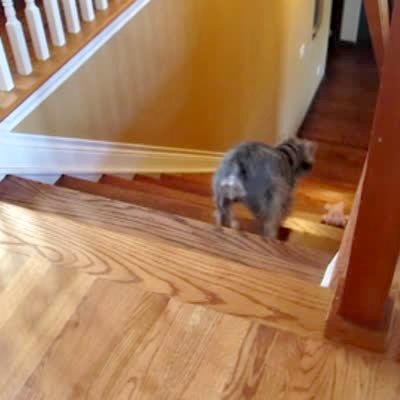 A small dog walks backwards up half a flight of hardwood stairs indoors. The woman behind the camera praises her.