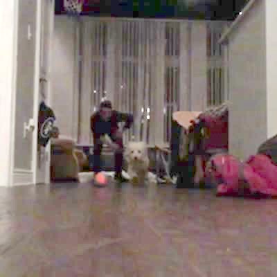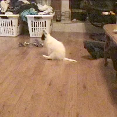 Dog slips around on hardwood floor inside the house when owner makes noises behind the camera that cause dog to run around. Dog doesn't fall, just has trouble standing up.