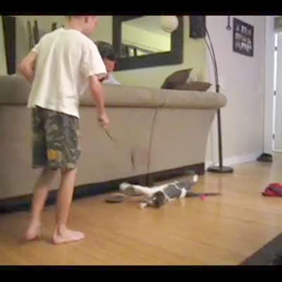 Cat leaps into the air and flips, landing hard on hardwood floor. Cat jumps to get a toy while playing with boy.