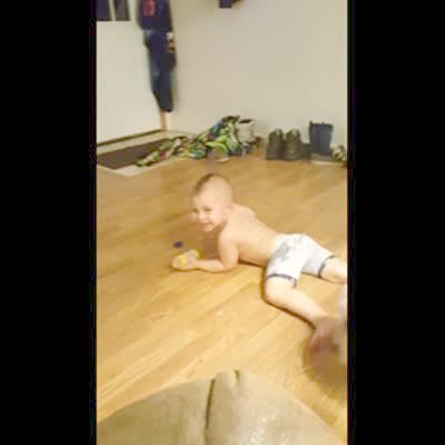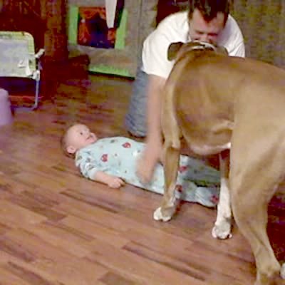 Beagle dog on the couch barks at baby boy laying on the hardwood floor. Baby laughs, dog runs around & spins in the baby's face.