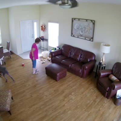 A woman attempts to dance for her dog in a dining room, when she slips on the hardwood floor and topples over. Security footage.