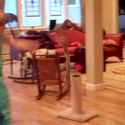 Tot girl waves a ribbon toy in front of cat, who tries to grab it with its paws. Cat stands on hind legs and falls backwards, landing on its back with a thud on hardwood floor.