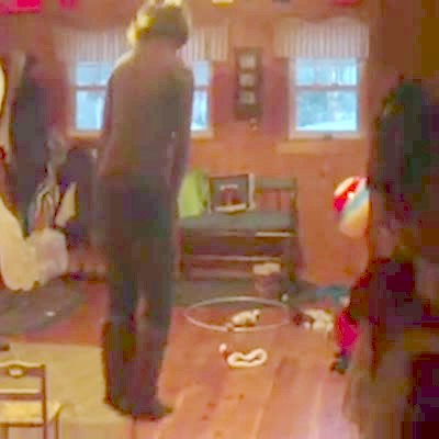 Tot boy pushes bucket around on hardwood living room floor, bucket makes trumpet/squeaking sound. Name that sound.