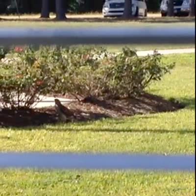 A hawk standing on a yard outdoors and flies directly into a window, scaring two people inside.