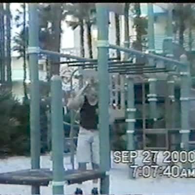 Man lifts up tot boy stepson at playground, kid bangs head on monkey bars. Wide shot.